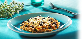 Añadir un sobre de Pasta sabor Boloñesa NutriCare a 200 ml de agua, mezclar bien con un tenedor y meter en el microondas durante 3 minutos a máxima potencia. A continuación, espolvorear el queso rallado sobre la pasta y decorar con las aceitunas.